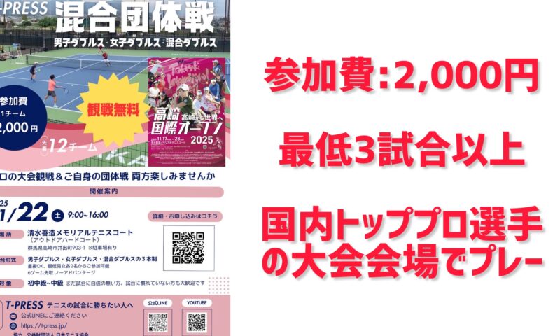 今回、T-PRESS初の取り組みとして日本テニス協会協力の元、高崎国際オープンが開催されている会場で団体戦を開催させて頂きます